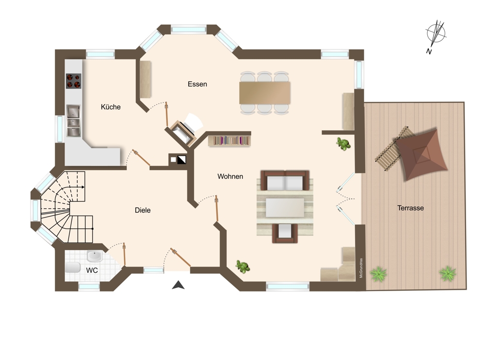 Das Erdgeschoss empfängt Sie mit einem hellen, einladenden Flur. Das Gäste-WC ist gleich im Eingangsbereich platziert. Die separate Küche ist funktional geschnitten und grenzt direkt an den großzügigen Wohn- und Essbereich an. Hier sorgen große Fensterflächen nicht nur für eine freundliche, lichtdurchflutete Atmosphäre, sondern gewähren auch einen wunderbaren Blick in den Garten. Von hier aus gelangen Sie auf die sonnige Terrasse – ein idealer Ort für gemeinsame Familienmomente oder entspannte Abende mit Blick in die grüne Umgebung.