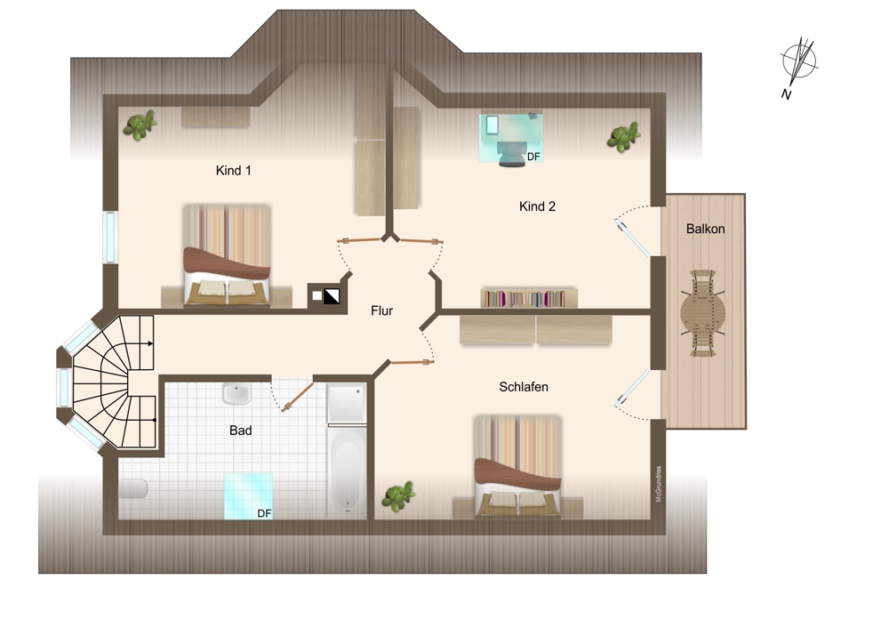 Im Dachgeschoss befinden sich zwei gemütliche Kinderzimmer, ein Elternschlafzimmer sowie ein großes Tageslichtbad mit Badewanne und Dusche. Zwei der Zimmer verfügen über einen Zugang zum Balkon – von hier aus genießen Sie einen herrlichen Panoramablick über die Natur von Einsiedel. Der ausgebaute Spitzboden bietet zusätzliche Abstellfläche.
