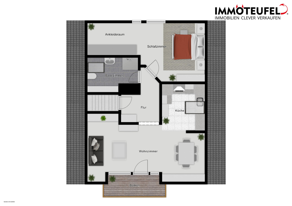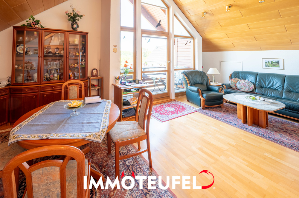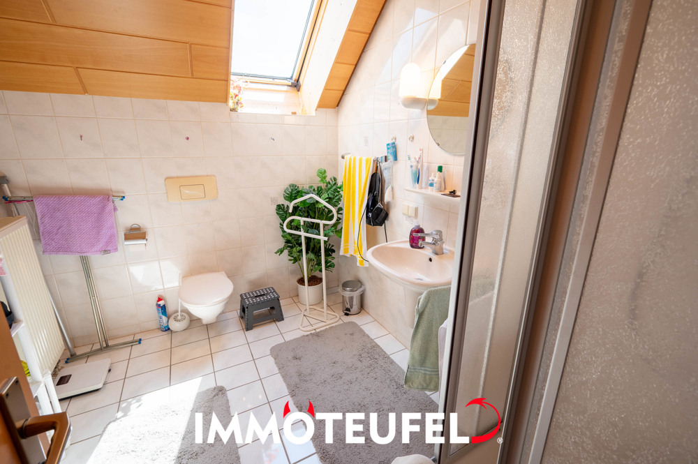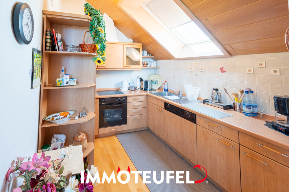 Im Dachgeschoss stehen zwei weitere helle Zimmer zur Verfügung. Eines davon verfügt über einen verglasten Giebel und Zugang zu einem Balkon mit schönem Fernblick. Auch auf dieser Etage ist eine Küche vorhanden, ebenso ein großzügiges Badezimmer mit Dusche, das das Raumangebot sinnvoll ergänzt.