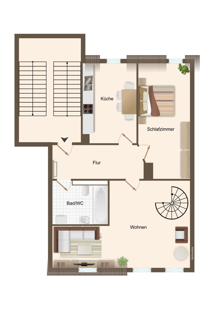 Die Wohnung erstreckt sich über zwei Ebenen und vermittelt durch ihre Maisonette-Bauweise ein besonders wohnliches und individuelles Raumgefühl. Im unteren Bereich befinden sich das Schlafzimmer, das Wohnzimmer, das Bad sowie die Küche. Die Einbauküche bietet praktische Stauraum- und Arbeitsflächen und ermöglicht ein sofortiges Einziehen ohne zusätzliche Anschaffungen. Das Badezimmer ist zeitlos gestaltet, verfügt über eine Badewanne und bietet zudem Platz für die Waschmaschine.