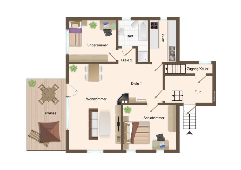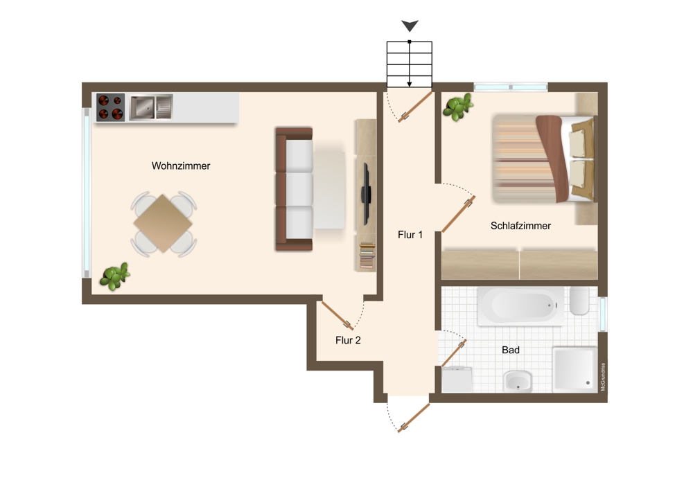 Ergänzt wird das Raumangebot durch ein Schlafzimmer, ein Kinderzimmer, ein Badezimmer mit Dusche und Wanne sowie eine Küche, die sich funktional in den Grundriss einfügt. Die Zimmer sind gut geschnitten und bieten vielseitige Möglichkeiten zur individuellen Gestaltung.