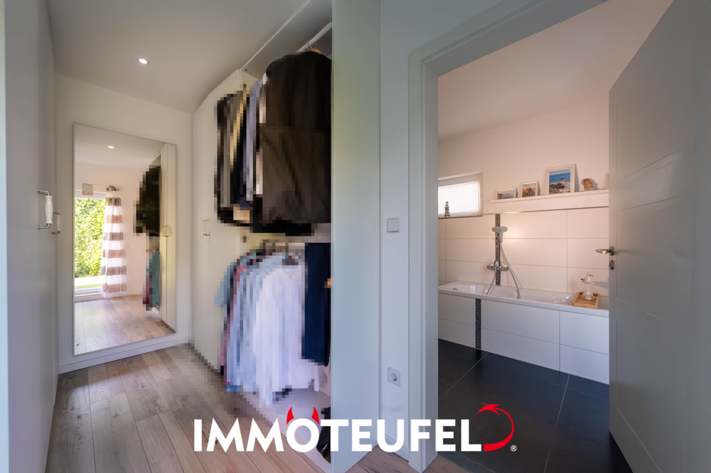 Besonderen Wohnkomfort schaffen die hochwertige Ausstattung und durchdachte Details: Außenjalousien an allen bodentiefen Fenstern sorgen für Beschattung und Sicherheit, die Gaszentralheizung mit Solarthermie wird durch einen Kamin im Wohnbereich unterstützt und eine Photovoltaikanlage auf dem Dach ermöglicht die Eigenstromversorgung. Zusätzlich steht ein großzügiger Dachboden als Stauraum zur Verfügung.