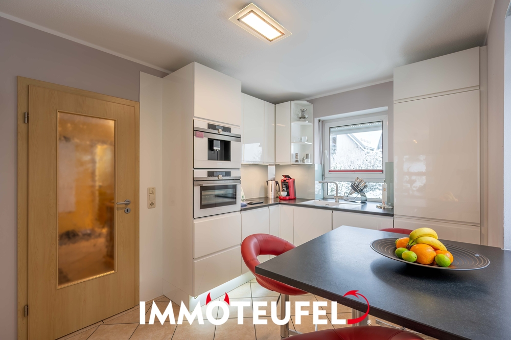Im Erdgeschoss erwartet Sie eine äußerst angenehme Wohnatmosphäre, die durch die im gesamten Bereich verlegte Fußbodenheizung zusätzlich unterstrichen wird. Der großzügige Wohnbereich wirkt dank der zahlreichen Fensterflächen besonders hell und einladend. Von hier aus haben Sie direkten Zugang zur etwa 40 Quadratmeter großen Terrasse, die einen wunderschönen Blick auf das gepflegte und grüne Grundstück bietet. An warmen Tagen sorgt die elektrische Markise für angenehmen Schatten und zusätzlichen Komfort. Unmittelbar angrenzend befindet sich die Küche, in der 2018 eine moderne, hochwertige Einbauküche installiert wurde. Diese ist mit erstklassigen Geräten ausgestattet, darunter eine integrierte Kaffeevollautomat sowie ein leistungsstarker Heißluft-/Umluftofen – ideal für alle, die Wert auf Qualität und Komfort legen. Das Badezimmer auf dieser Etage ist mit einer Dusche und einem WC ausgestattet und bietet dadurch praktischen Zusatzkomfort.