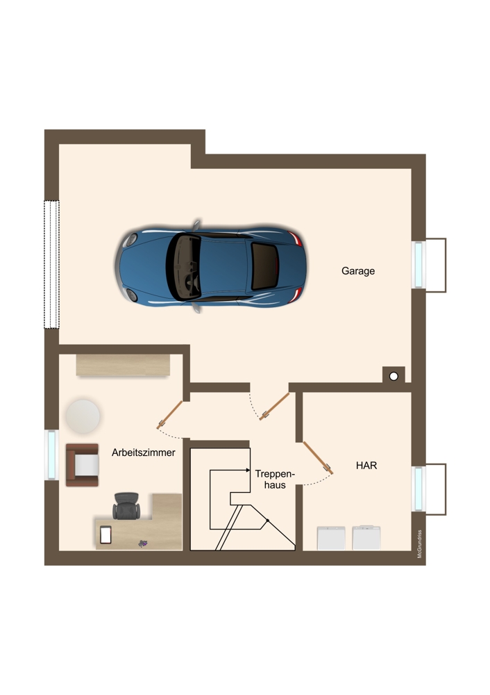 Der Keller überzeugt durch seine großzügige Fläche und vielfältigen Nutzungsmöglichkeiten. Neben einem weiteren Zimmer, das sich hervorragend als Büro, Gäste- oder Hobbyraum eignet, befinden sich hier der Hauswirtschaftsraum sowie der Zugang zur integrierten Garage. Diese ist mit einem elektrischen Rolltor versehen und fügt sich funktional und praktisch in den Grundriss ein.