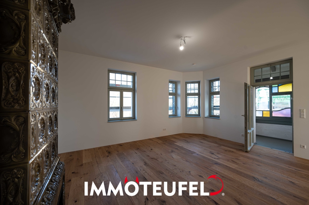 Ein besonderes Highlight des Wohnzimmers ist der liebevoll restaurierte Kachelkamin, der dem Raum eine gemütliche und nostalgische Atmosphäre verleiht. Vom Wohnzimmer aus gelangen Sie in die Loggia, die zusätzlichen Platz für entspannte Stunden bietet und den Charme des Raums unterstreicht. Direkt an den Wohnbereich grenzt die offene, moderne Küche, die ebenfalls über einen Zugang zum Balkon verfügt, der in den ruhigen Innenhofbereich führt.