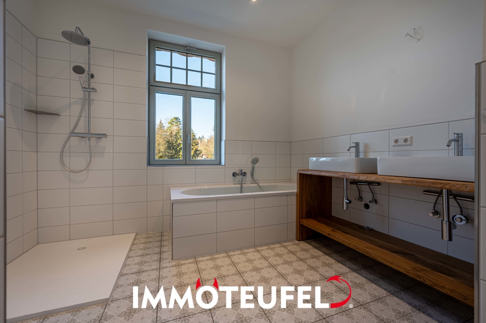 + Bad mit Dusche, Badewanne, Fenster, Doppelwaschtisch und Waschmaschinenanschluss